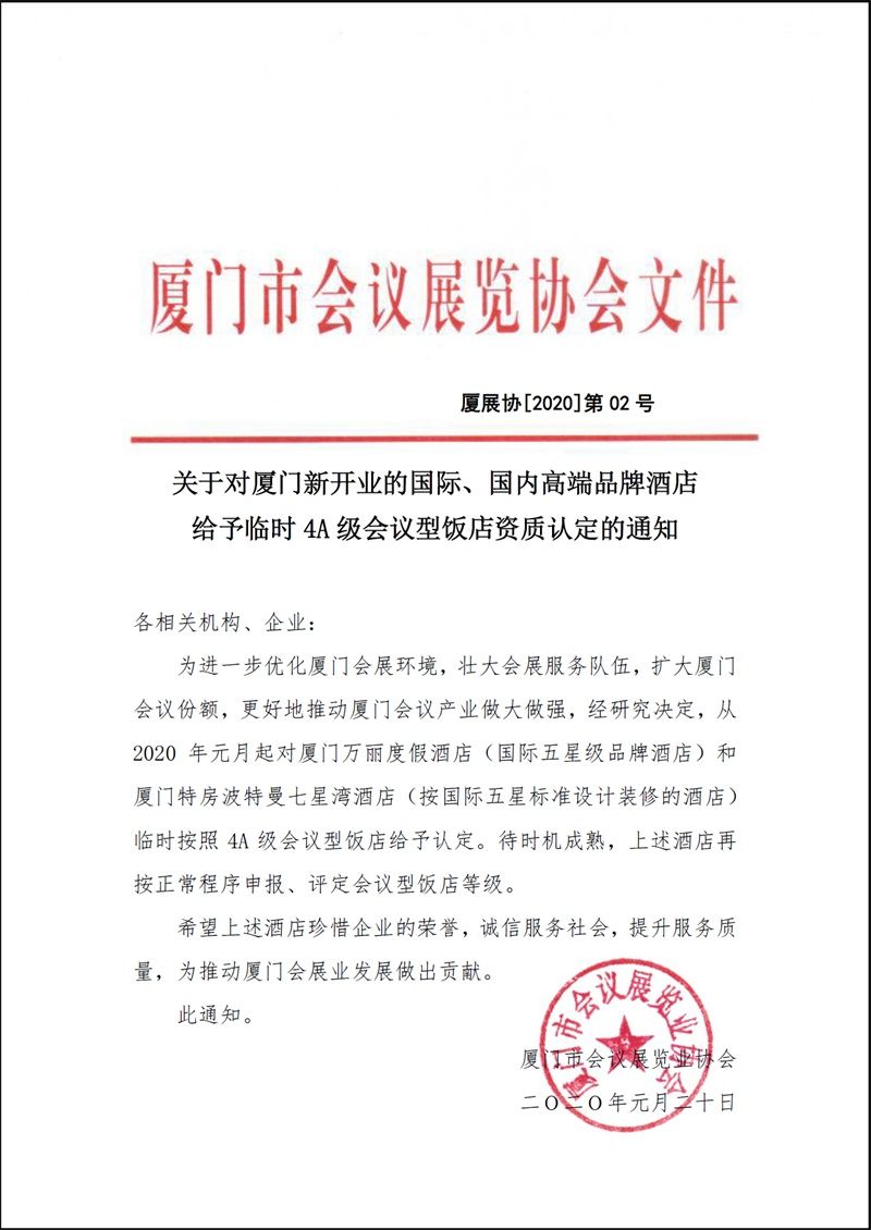 关于对厦门新开业的国际、国内高端品牌酒店给予临时4A级会议型饭店资质认定的通知