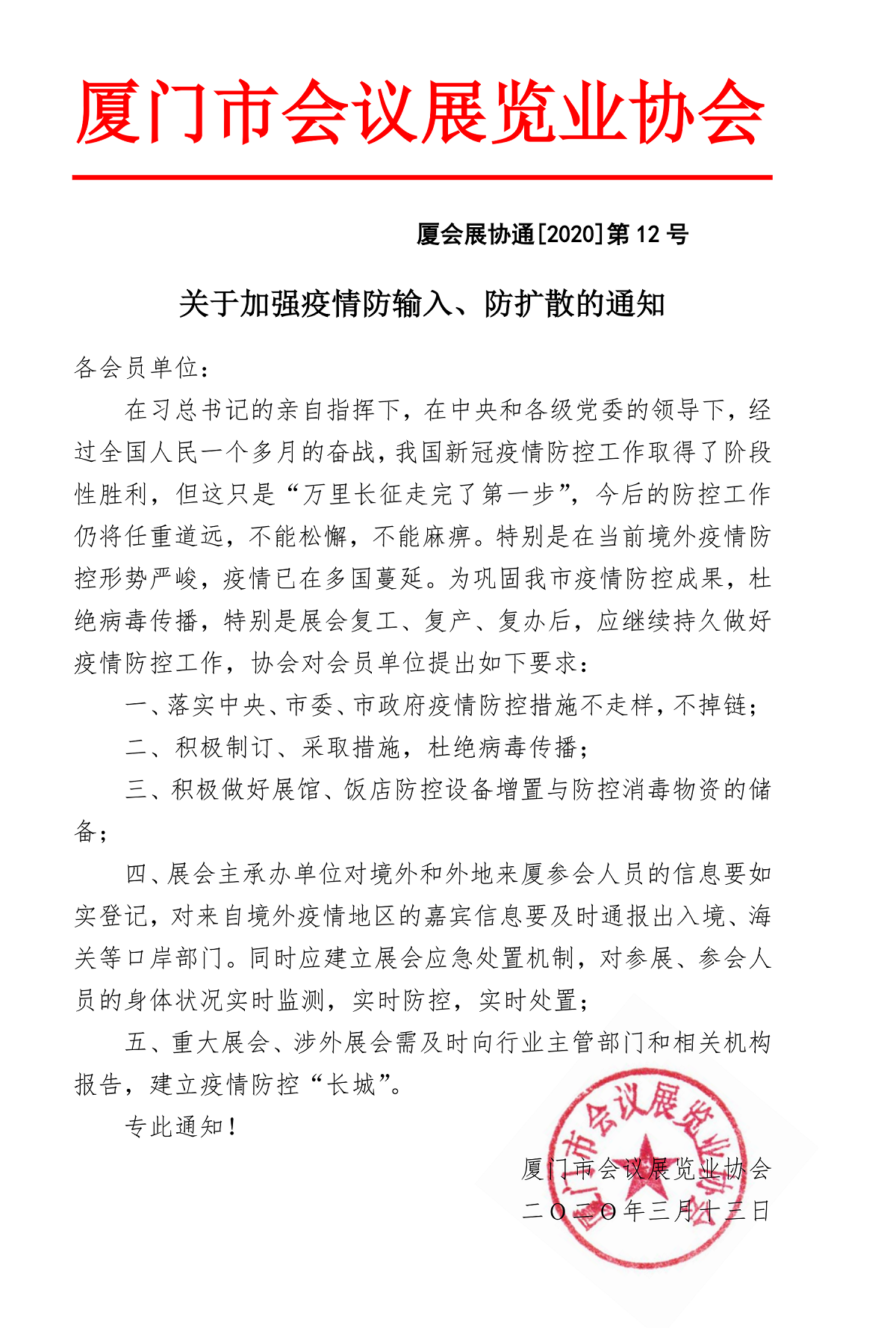 厦会展协通[2020]第12号关于加强疫情防输入、防扩散的通知