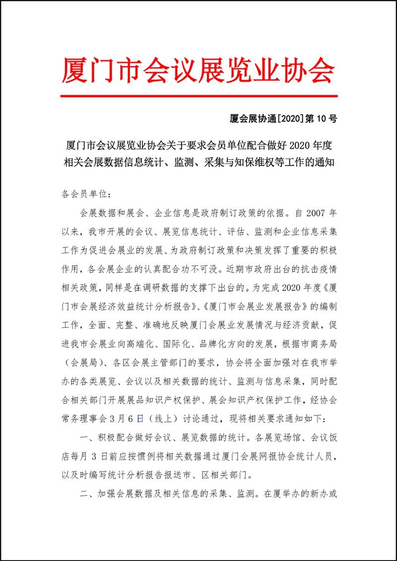 厦会展协通[2020]第10号 厦门市会议展览业协会关于要求会员单位配合做好2020年度相关会展数据信息统计、监测、采集与知保维权等工作的通知