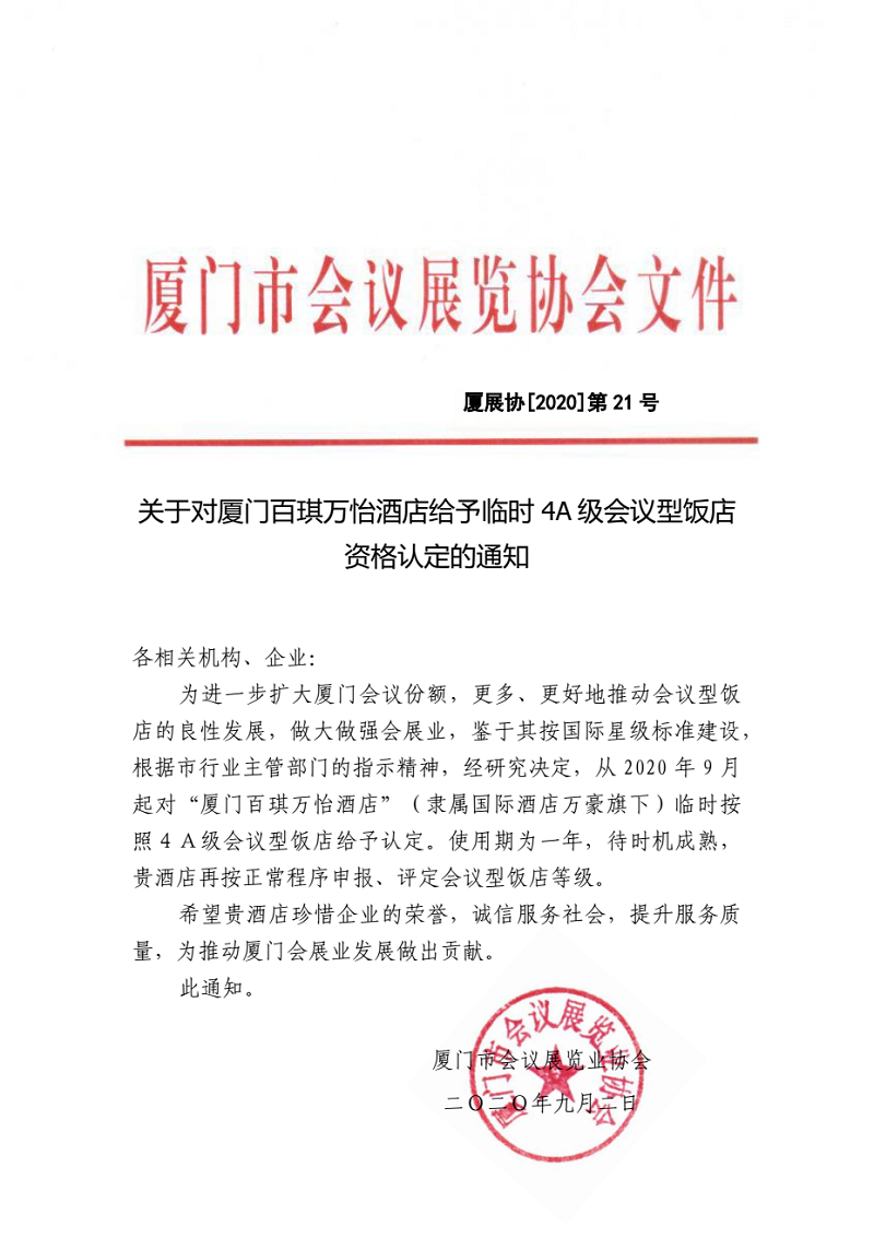 第21号 关于对厦门百琪万怡酒店给予临时4A级会议型饭店资格认定的通知