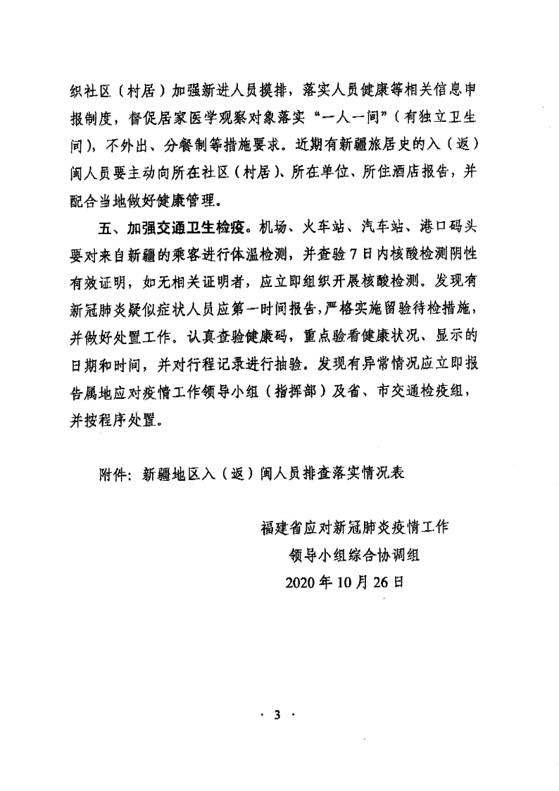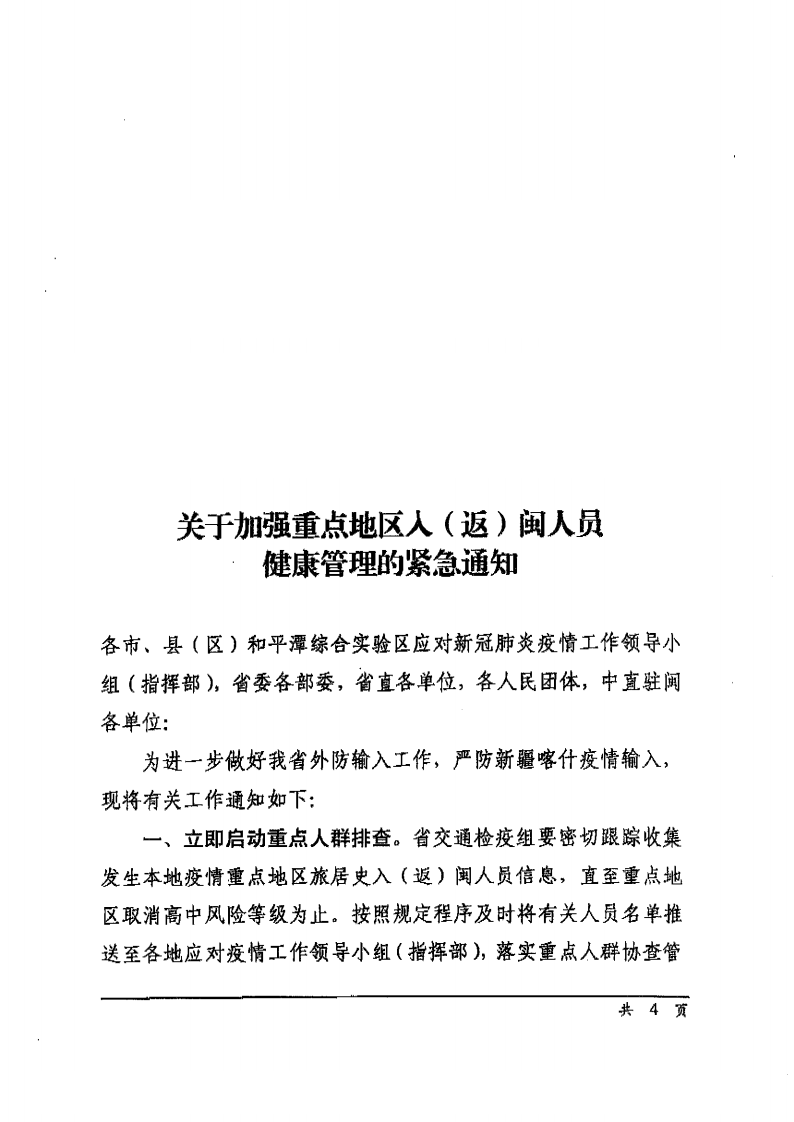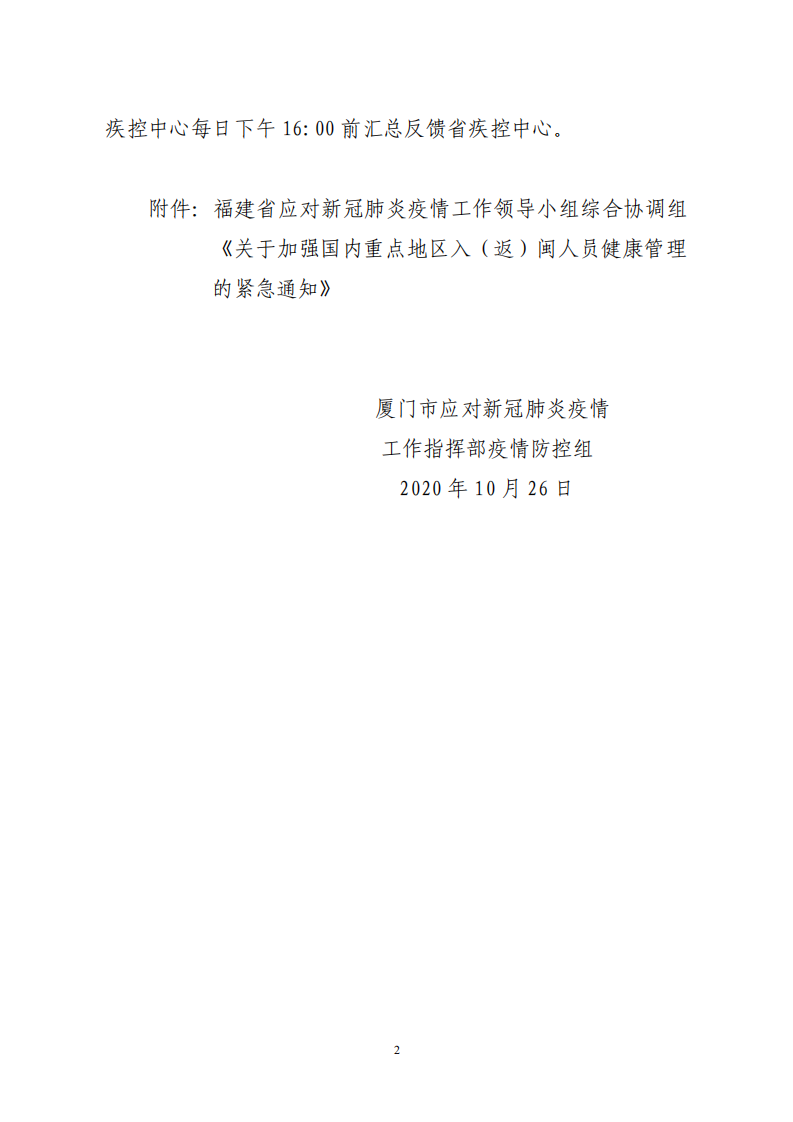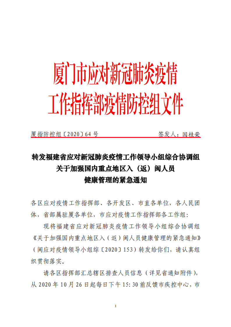 厦指防控组〔2020〕64号 转发关于加强国内重点地区入(返)闽人员健康管理的紧急通知