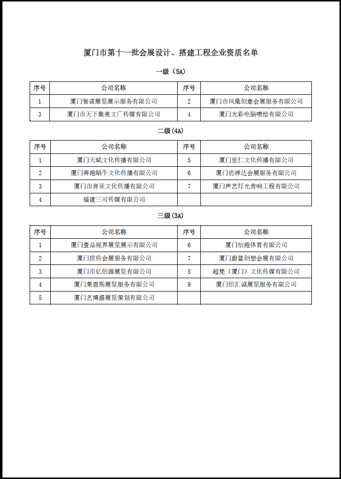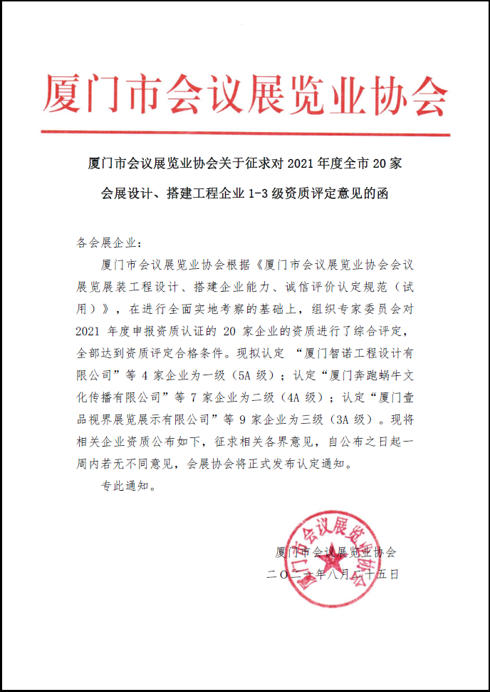 厦门市会议展览业协会关于征求对2021年度全市20家会展设计、搭建工程企业1-3级资质评定意见的函