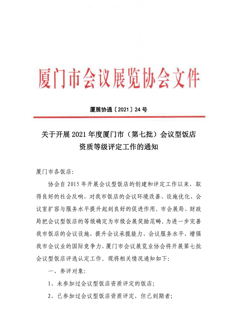 24号 关于开展2021年度厦门市(第七批)会议型饭店资质等级评定工作的通知
