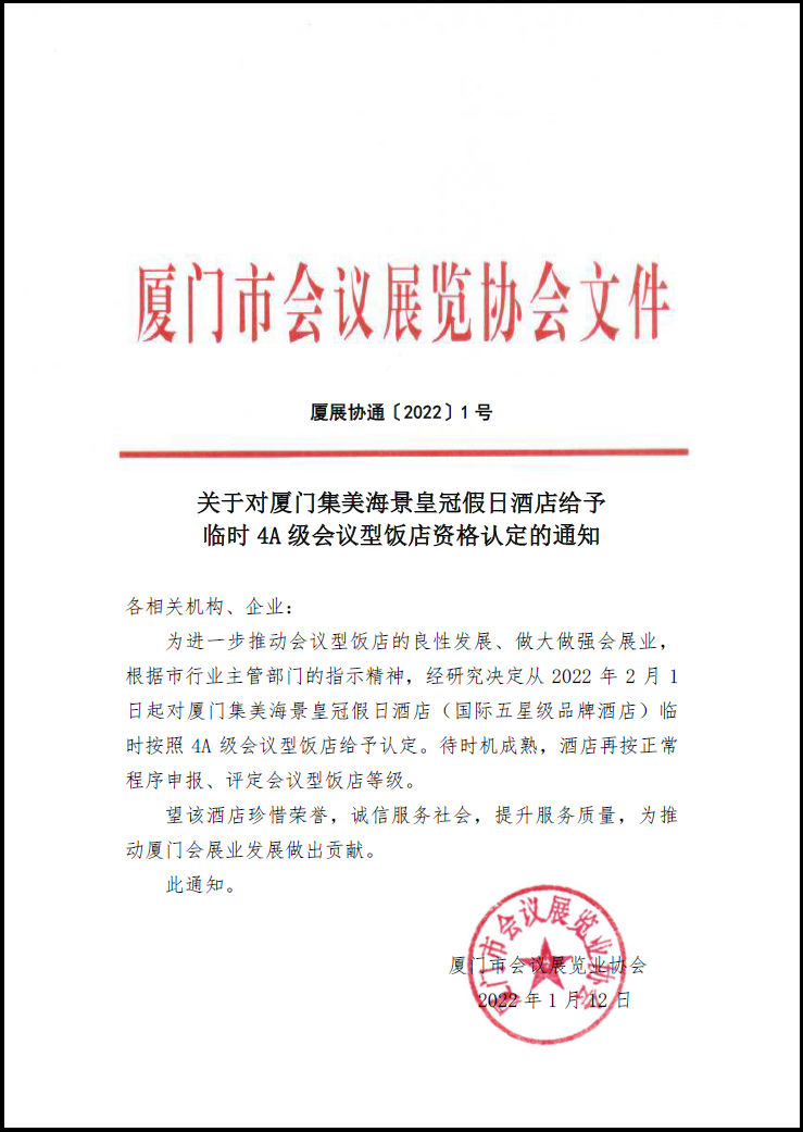 关于对厦门集美海景皇冠假日酒店给予临时4A级会议型饭店资格认定的通知