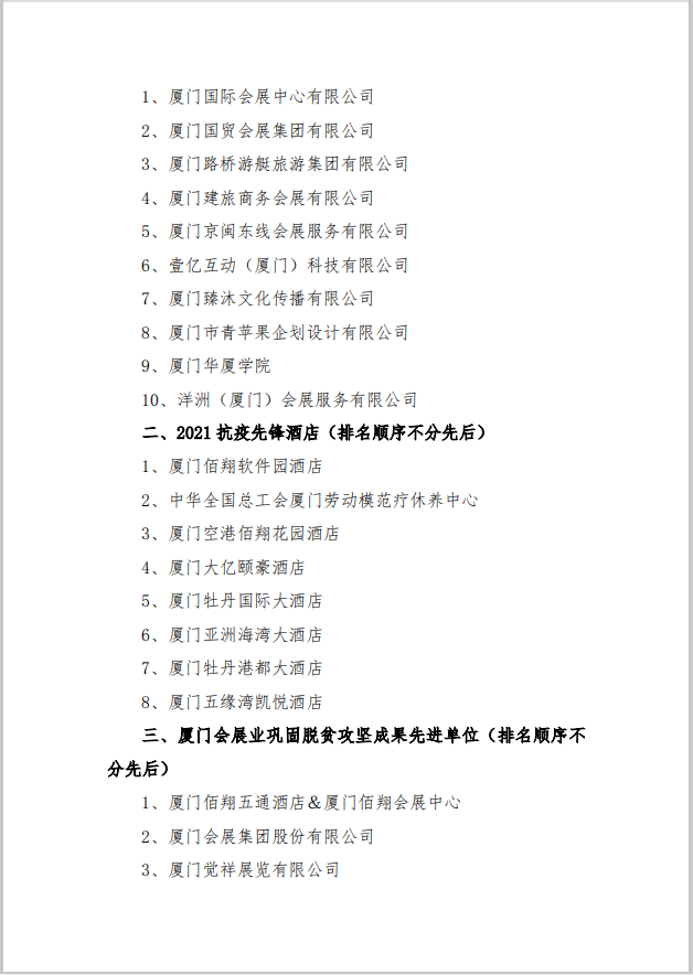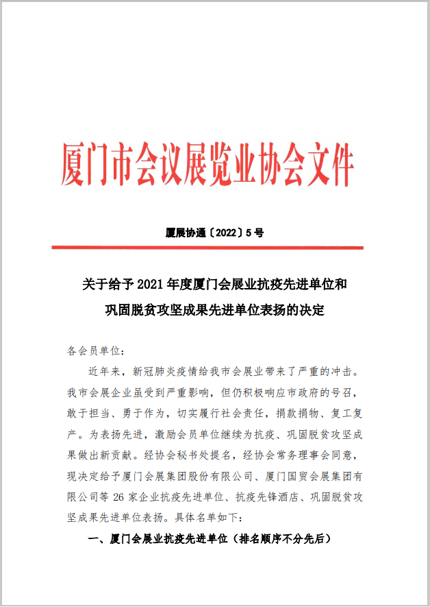 关于给予2021年度厦门会展业抗疫先进单位和巩固脱贫攻坚成果先进单位表扬的决定