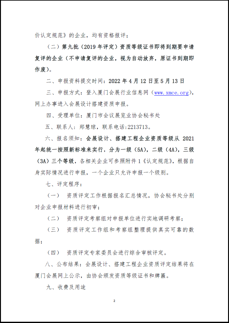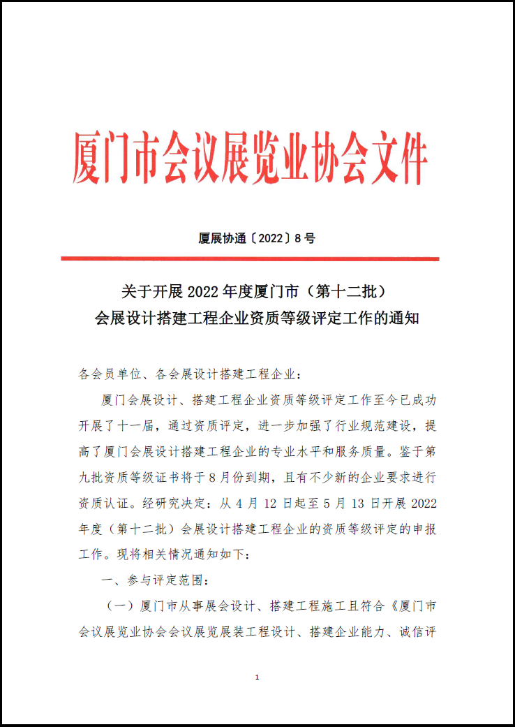 关于开展2022年度厦门市(第十二批)会展设计搭建工程企业资质等级评定工作的通知