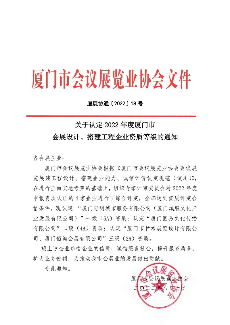 关于认定2022年度厦门市会展设计、搭建工程企业资质等级的通知