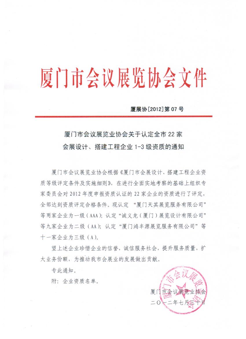 厦门市会议展览业协会根据《厦门市会展设计、搭建工程企业资质等级评定条件及实施细则》,在进行全面实地考察的基础上组织专家委员会对2012年度申报资质认证的22家企业的资质进行了评定,全部达到资质评定合格条件。现认定 “厦门天其展览服务有限公司”等两家企业为一级(AAA);认定“诚义龙(厦门)展览设计有限公司”等九家企业为二级(AA);认定“厦门鸿丰源展览服务有限公司”等十一家企业为三级(A)。 望上述企业珍惜企业的信誉,诚信服务社会,提升服务质量,扩大业务份额,为推动我市会展业的发展做出贡献。 专此通知。 附:企业资质名单。 厦门市会议展览业协会 二O一二年七月三十日