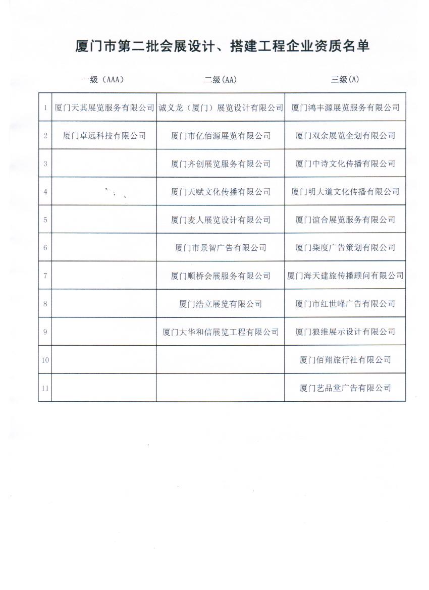厦门市会议展览业协会关于认定全市22家会展设计、搭建工程企业1-3级资质的通知