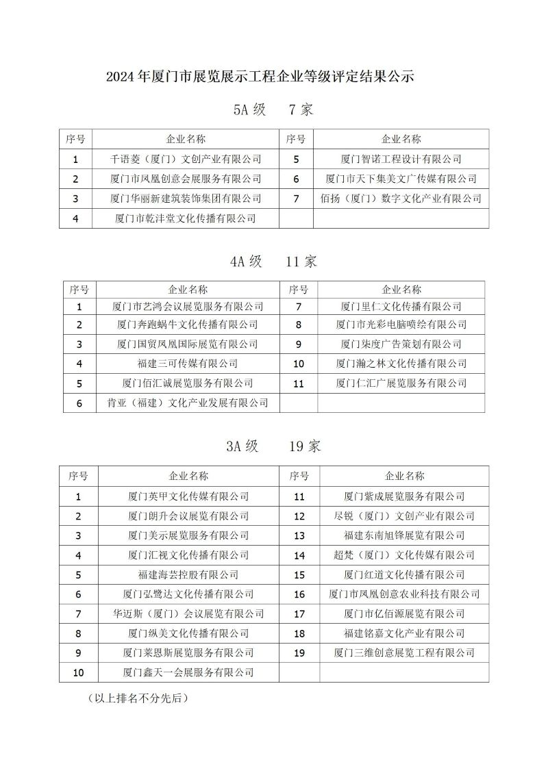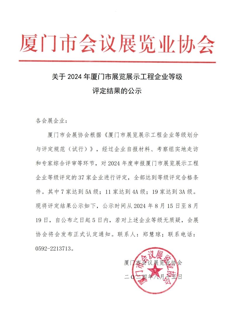 关于2024年厦门市展览展示工程企业等级评定结果的公示