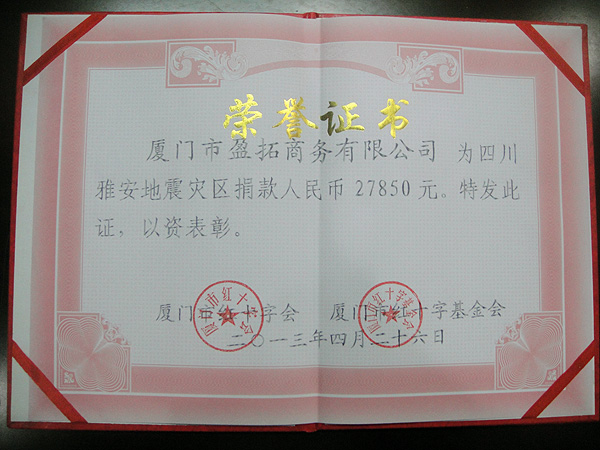 4月26日下午,厦门市盈拓商务有限公司通过厦门市红十字基金会向雅安地震灾区人民爱心捐款27850元,帮助灾区人民抗震救灾,重建家园。