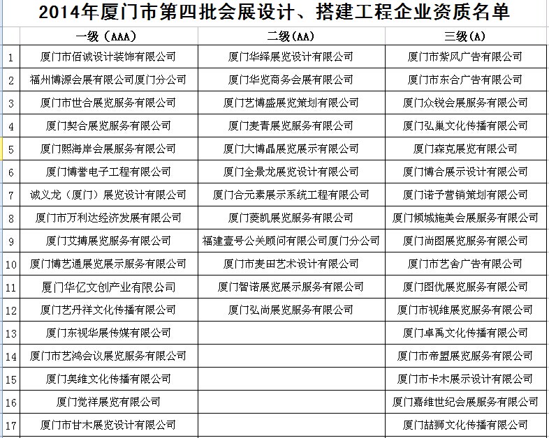 各会展企业: 厦门市会议展览业协会根据《厦门市会展设计、搭建工程企业资质等级评定条件及实施细则》,在进行全面实地考察的基础上组织专家委员会对2014年度申报资质认证的54家企业的资质进行了评定,全部达到相应资质评定条件。现认定“厦门市佰诚设计装饰有限公司”等十九家企业为一级(AAA);认定“厦门华绎展览设计有限公司”等十二家企业为二级(AA);认定“厦门市紫风广告有限公司”等二十三家企业为三级(A)。现将相关企业资质公布如下,征求相关各界意见,自公布之日起一周内若无不同意见,会展协会将正式发布确认通知。 专此通知。
