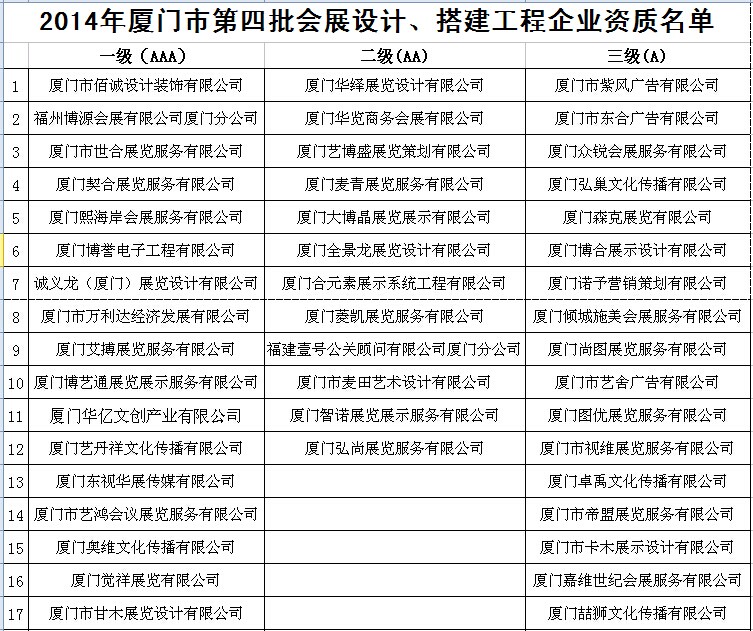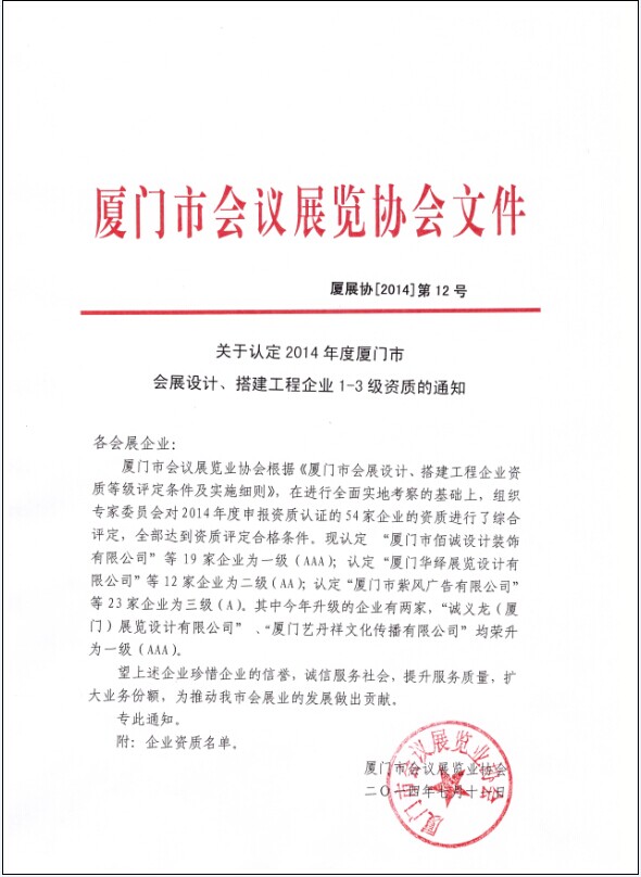 关于认定2014年度厦门市会展设计、搭建工程企业1-3级资质的通知