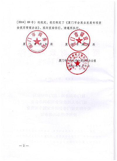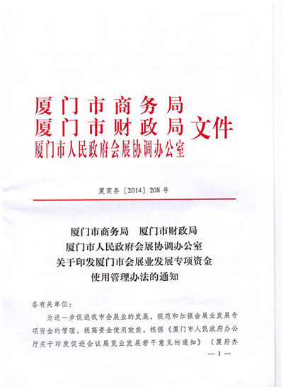 原文下载: 厦门市商务局 厦门市财政局 厦门市人民政府会展协调办公室关于印发厦门市会展业发展专项资金使用管理办法的通知