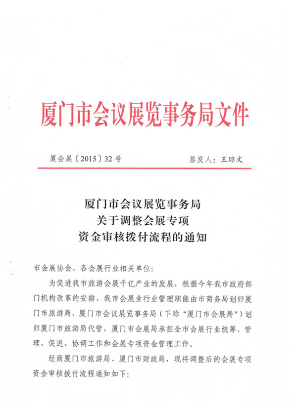 厦门市会议展览事务局关于调整会展专项资金审核拨付流程的通知