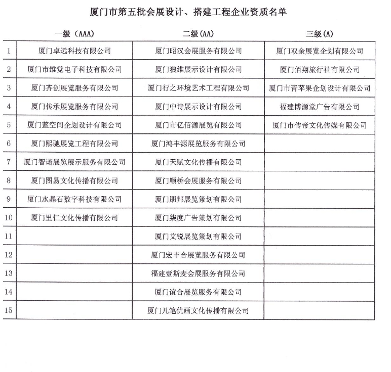 厦门市会议展览业协会根据《厦门市会展设计、搭建工程企业资质等级评定条件及实施细则》,在进行全面实地考察的基础上,组织专家委员会对