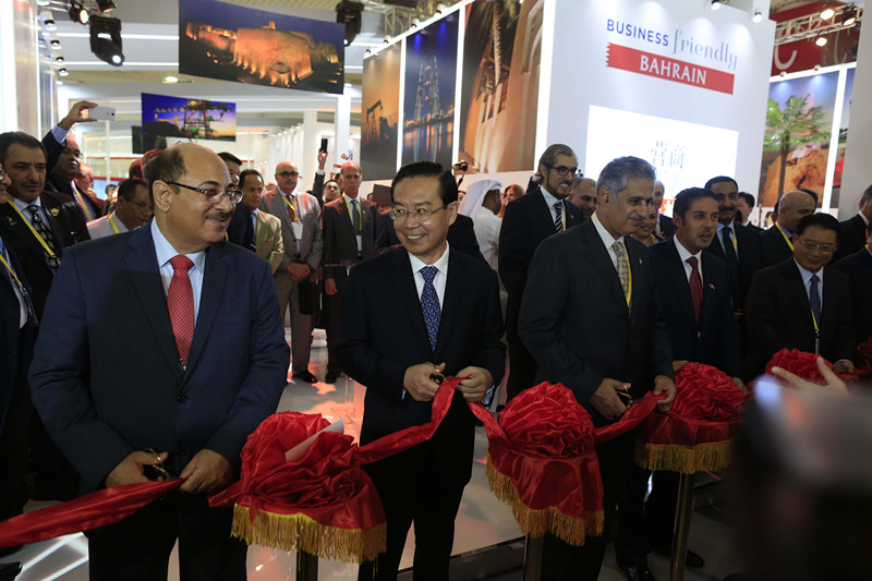 ![]() 2015年9月8日,福建省省长苏树林(左二)与巴林官员共同为2015厦门国际投资贸易洽谈会主宾国巴林剪裁开馆。