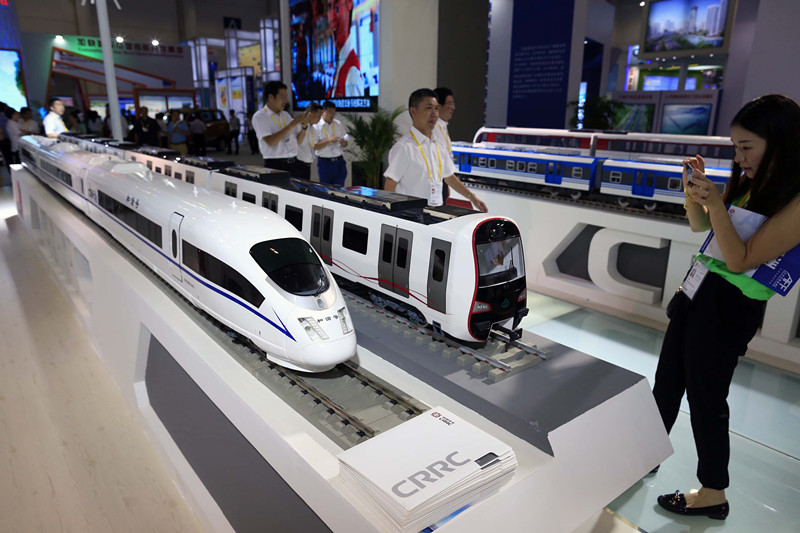 ![]() 2015年9月8日,参观者在观赏中国中车的动车组模型。