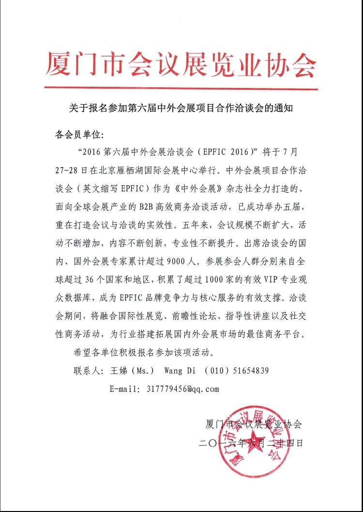 指导单位:厦门市会议展览局 主承办单位:厦门市会议展览业协会 联系电话: 86-592-5959074、2213713 电子信箱:xmcea3@163.com