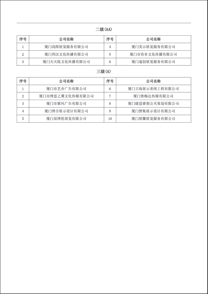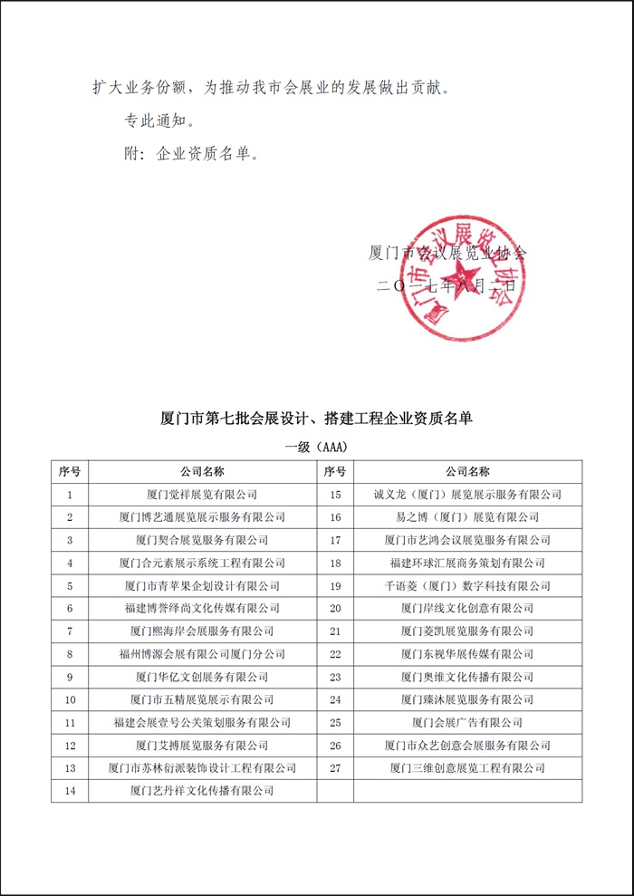 关于认定2017年度厦门市 会展设计、搭建工程企业1-3级资质的通知