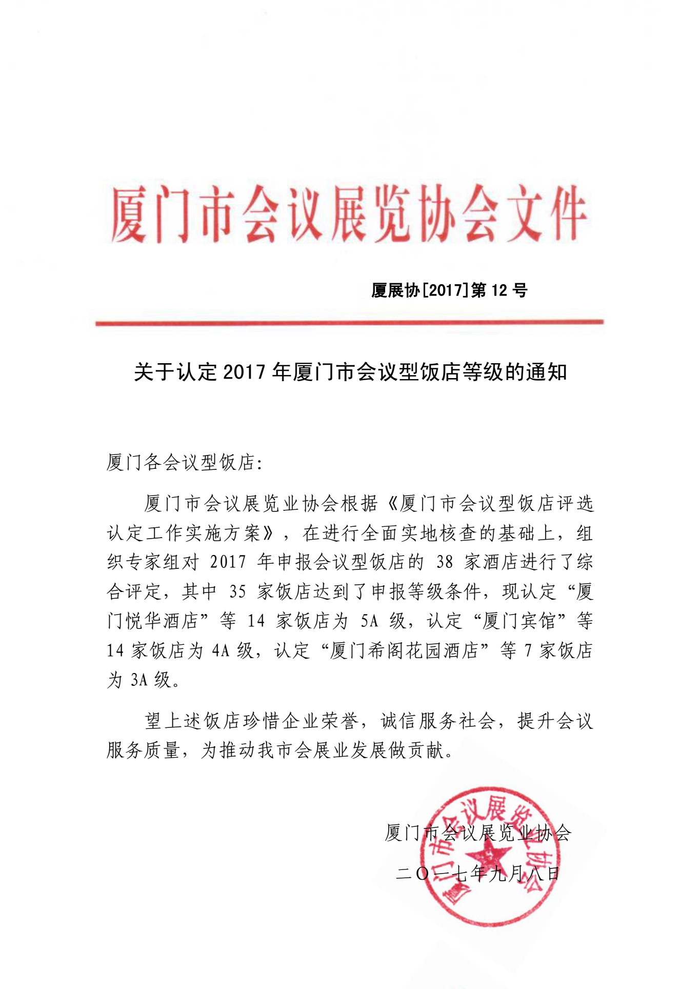 关于认定2017年厦门市会议型饭店等级的通知