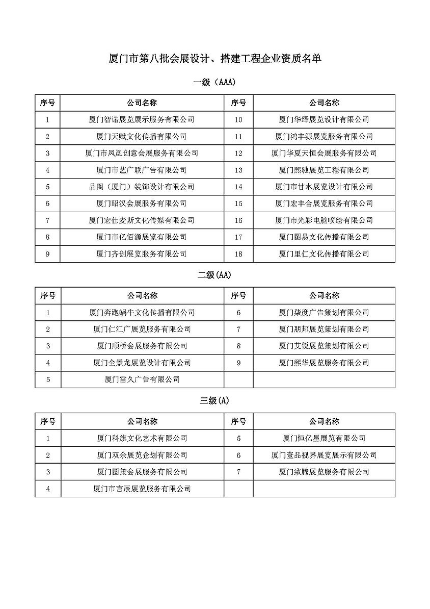 关于认定2018年度厦门市会展设计、搭建工程企业1-3级资质的通知
