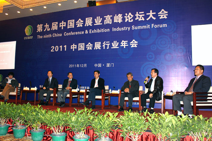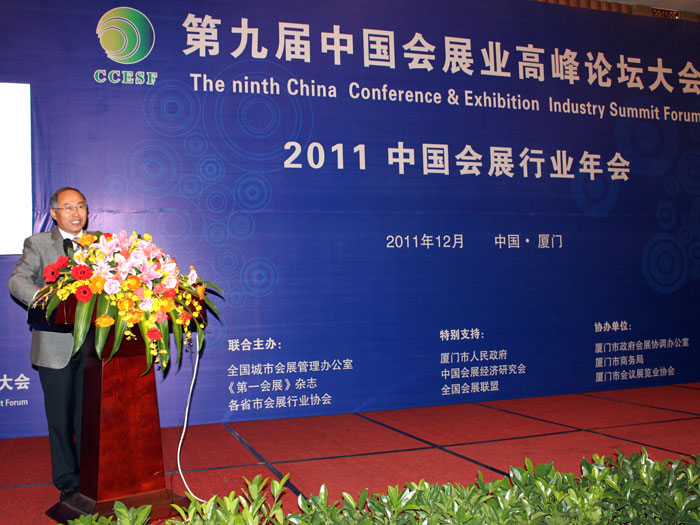 12月21日,由全国城市会展管理办公室、《第一会展》杂志、全国会展联盟、各省市会展行业协会等联合举办的“第九届中国会展业高峰论坛大会•2011中国会展行业年会(CCESF)”在厦门京闽北海湾酒店隆重举行。国际展览业协会轮值主席陈先进、中国会展经济研究会常务副会长陈泽炎、浙江省国际会展业协会会长郭牧、中国会展经济研究会副会长兼秘书长李永江、珠三角会展联盟秘书长、广州市会展行业协会会长李霞辉、西安市会展业发展办公室常务副主任汪涛、厦门市人民政府副秘书长朱奖思、厦门市商务局副局长傅如荣等领导出席会议并致辞。