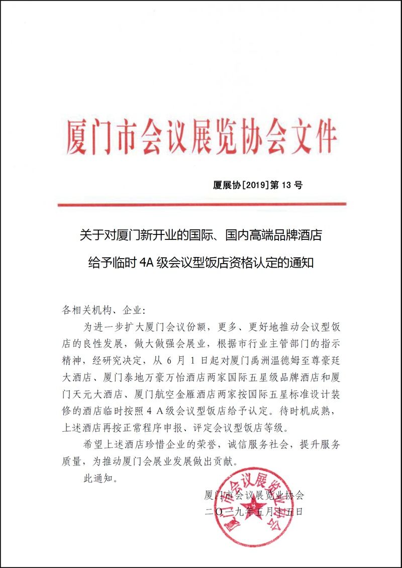 关于对厦门新开业的国际、国内高端品牌酒店给予临时4A级会议型饭店资格认定的通知