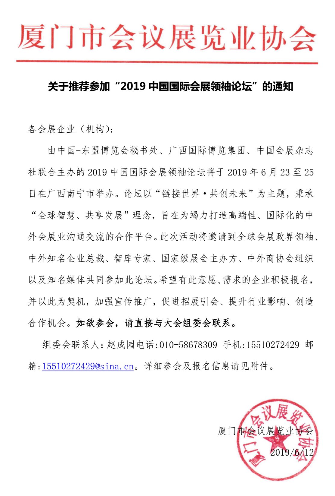 关于推荐参加“2019中国国际会展领袖论坛”的通知