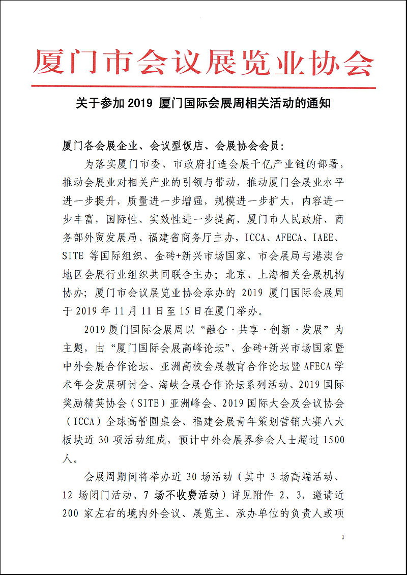 关于参加2019厦门国际会展周相关活动的通知