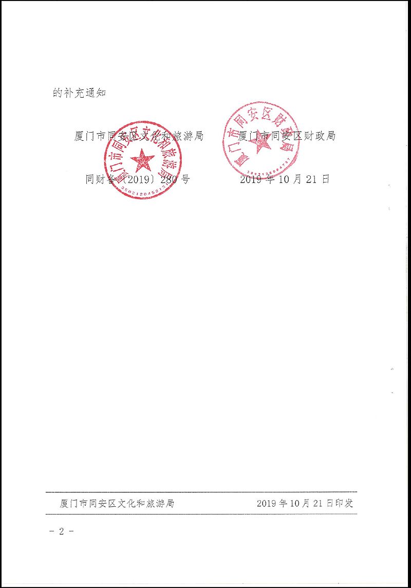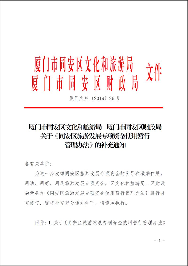 厦门市同安区文化和旅游局 厦门市同安区财政局关于《同安区旅游发展专项资金使用暂行管理办法》的补充通知(厦同文旅〔2019〕26号)