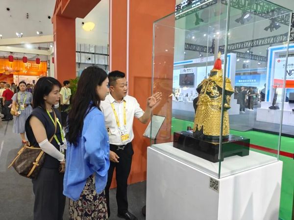 Weiyi's lacquer thread carving piece, titled "Divine Martial Grand Marshal", is based on a Tang Dynasty (618-907) military general and blended with modern sculptural forms. The work incorporates traditional elements such as tiger patterns, exuding a sense of Chinese majesty. The piece is located in the most prominent spot in the exhibition area.